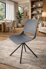 Modern grey molded chair with durable black metal legs, ideal for dining, lounge, or office spaces.